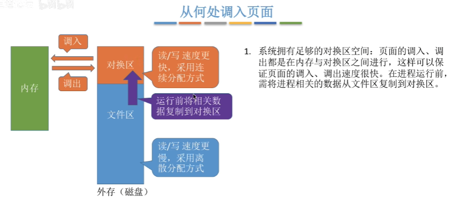 从什么地方调入页面,这与外存的对换区大小有关,若对换区足够大,则页面的调入调出是内存与对换区之间进行的,如下图:
