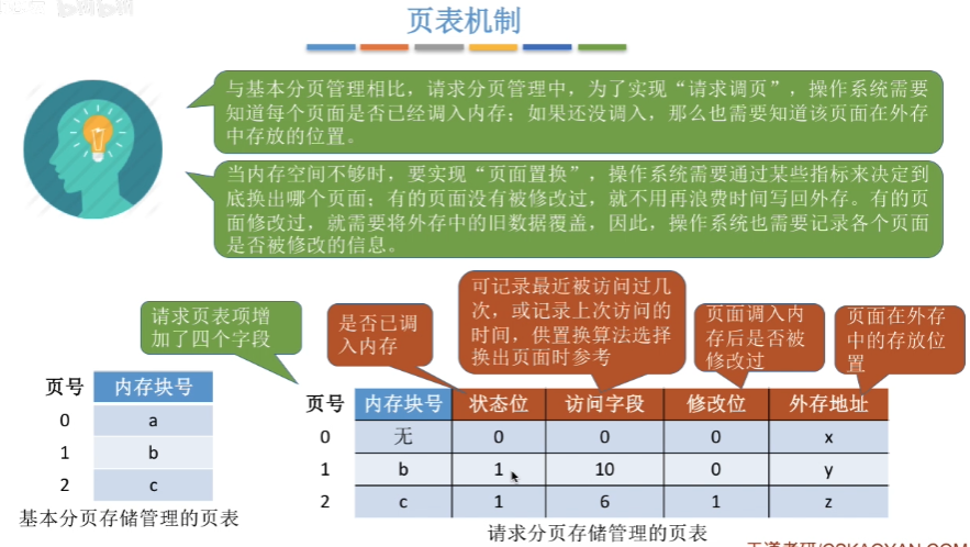 与基本分页的页表不一样的是,请求分页的页表需要添加状态位来标志该页面是否被调入内存,如果被访问的页面没有调入内存,还需要先调入内存。