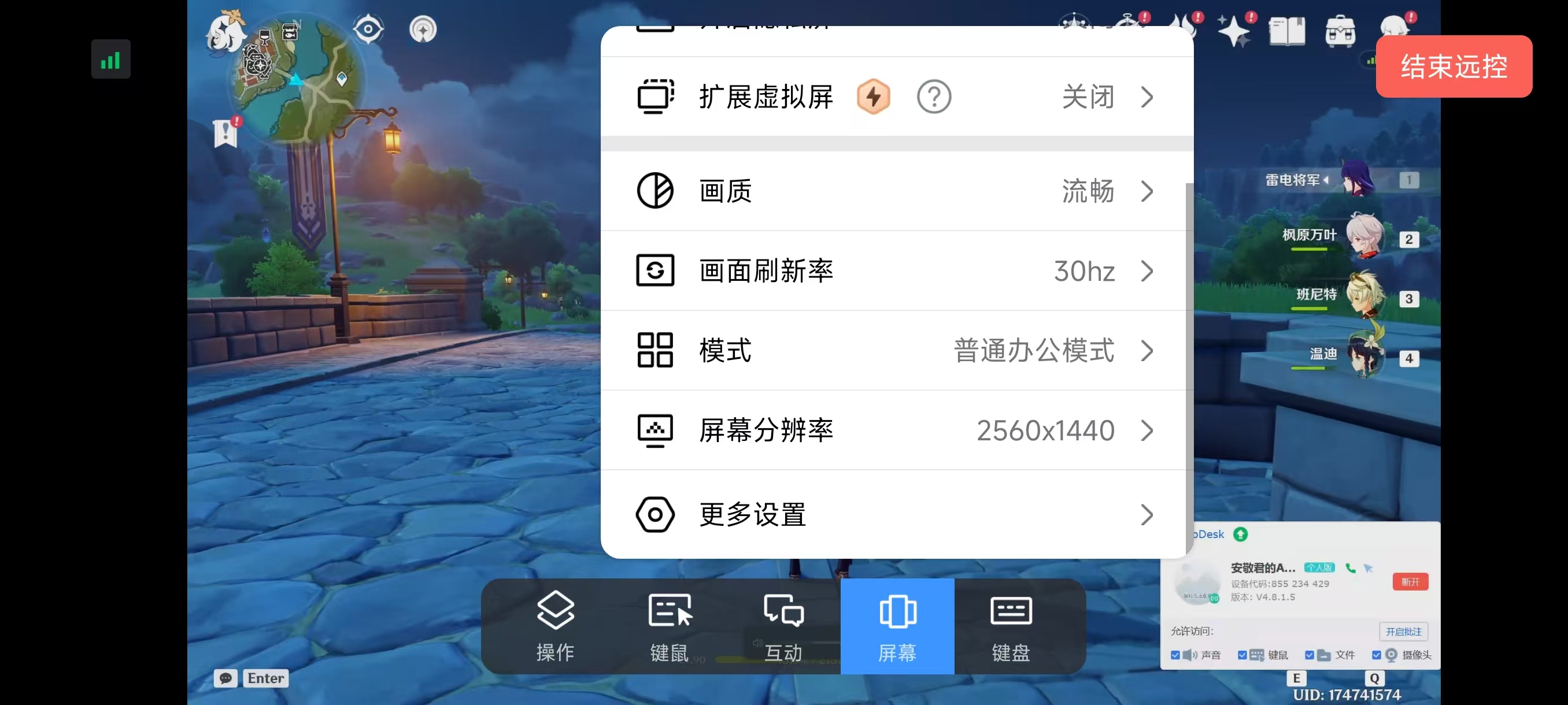 ToDesk: 整体画面清晰度与流畅度略逊于网易 UU 远程,免费版下画面仅能达到常规高清水准,帧率稳定在 60Hz 左右,无额外高帧 / 增强显示选项,观感相对保守。