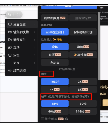 远程表现与ToDesk相近,免费版的帧率、画质上限有限,高帧率、高清画质等进阶配置均需付费解锁。实测中帧率同样难以突破30帧,延迟控制中规中矩,画面细节还原一般