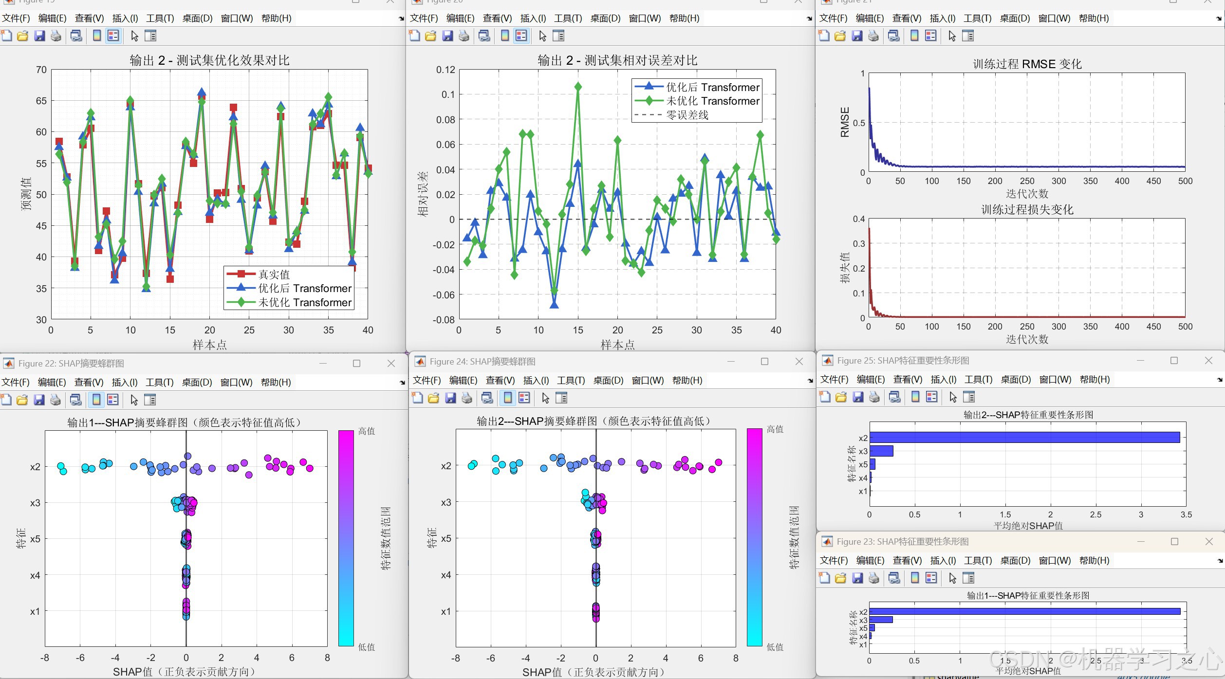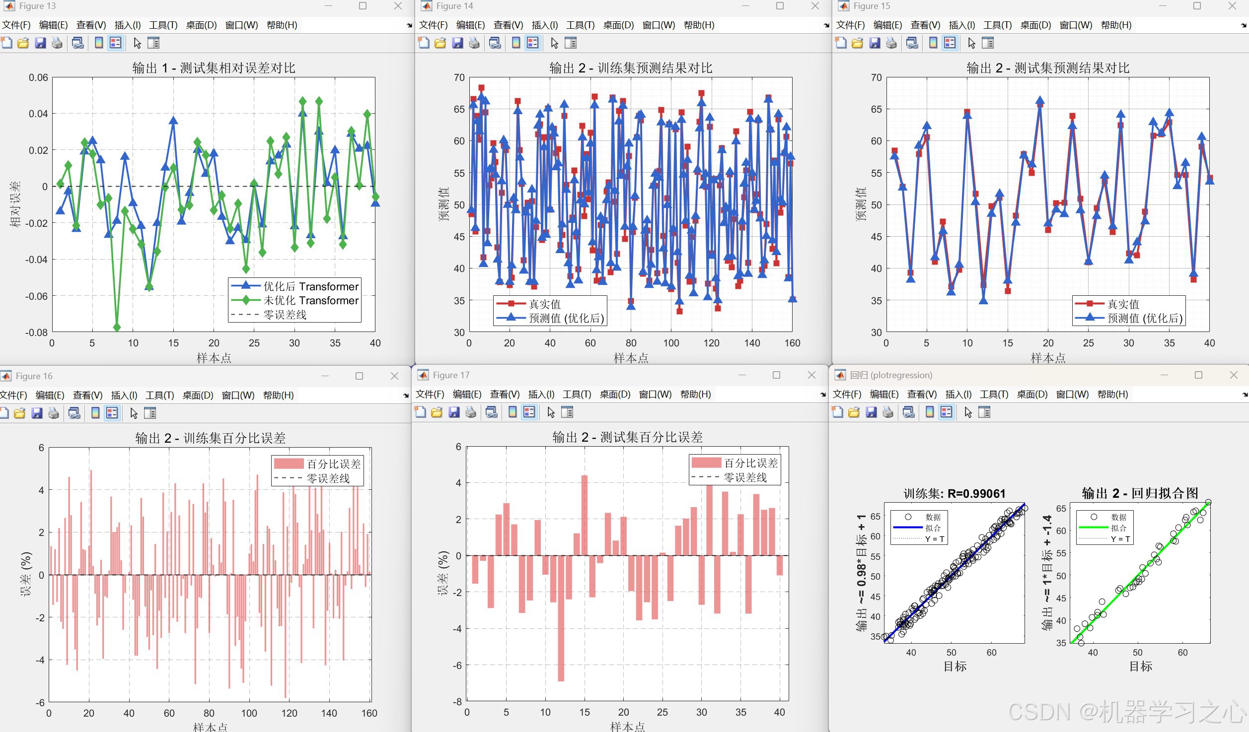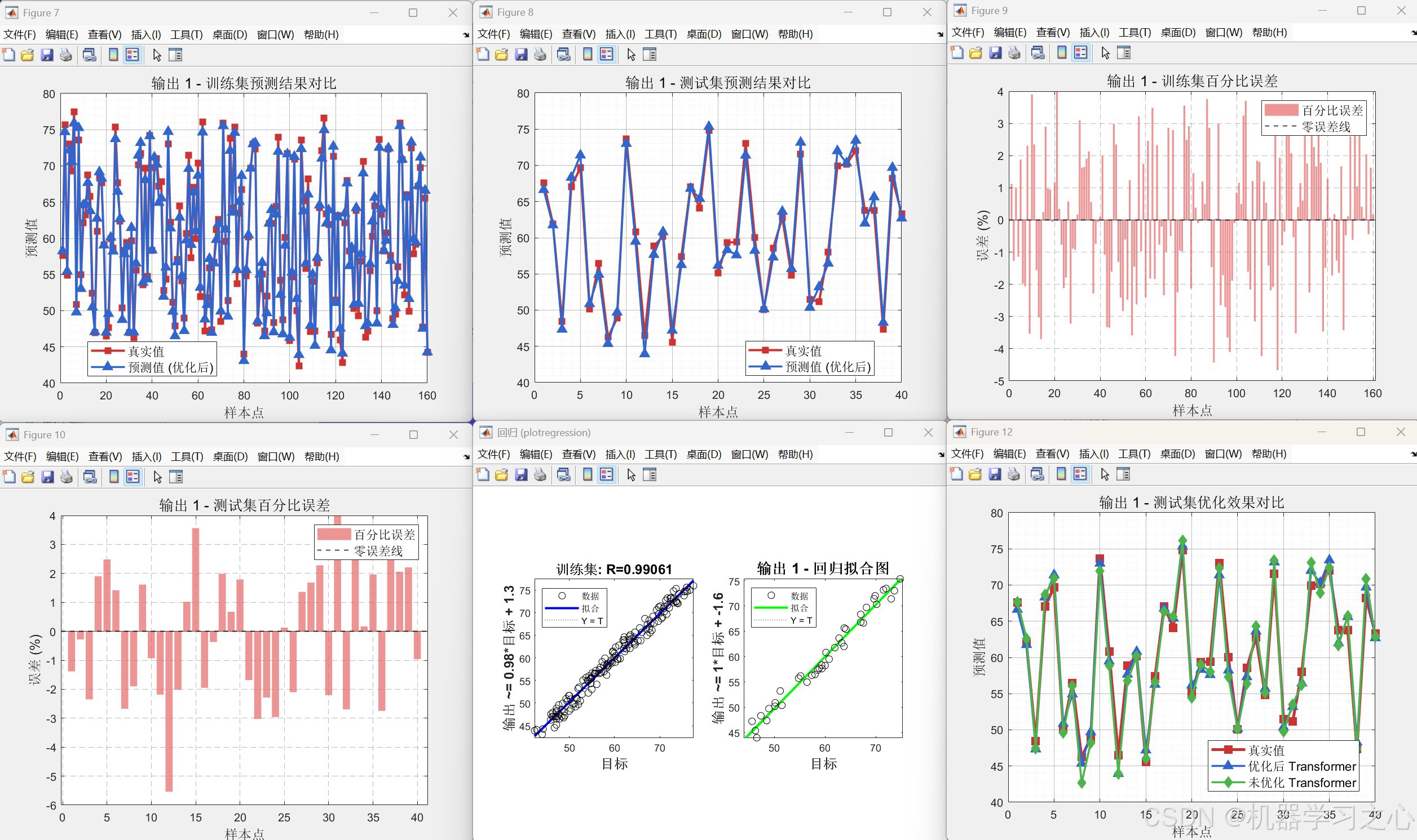 bestheads构建与fit.m中类似但训练轮数更多(500 轮)的 Transformer。 - 训练与预测 :训练优化模型,对训练集、测试集进行预测并反归一化,同时调用