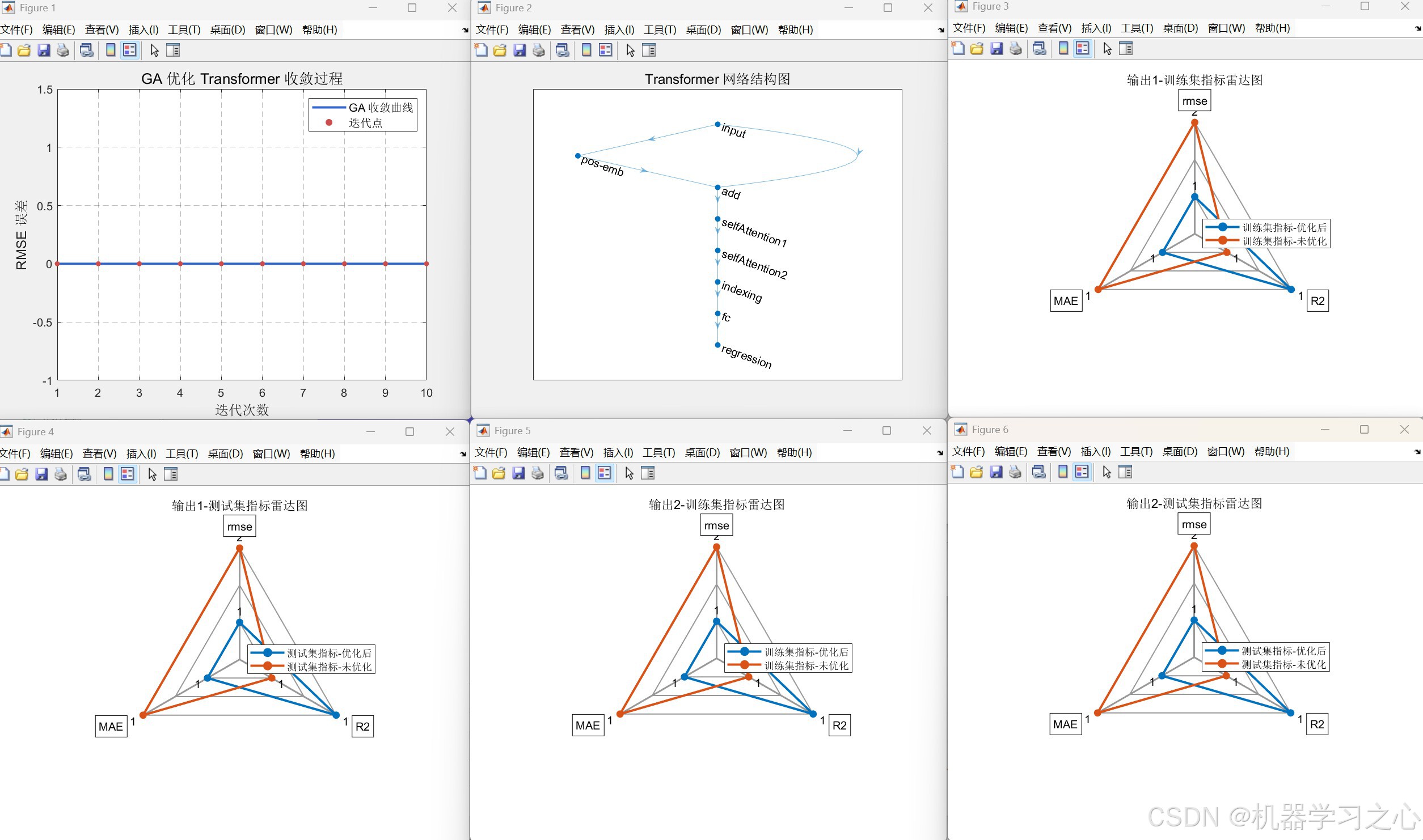 yuantrans.m得到未优化(heads=1)的对比结果。 - 性能评估与可视化:计算 RMSE、R²、MAE,绘制预测对比图、百分比误差柱状图、回归拟合图、雷达图等。