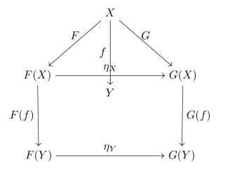 (交换图:对象X,F(X)和G(X),态射f,F(f),G(f),η_X,η_Y构成可交换的平行四边形)