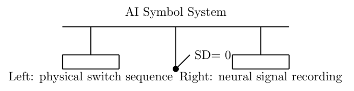 (天平横梁,中央指针指示"序位差=0",左盘标"物理开关序列",右盘标"神经信号记录",中央标"AI符号系统")