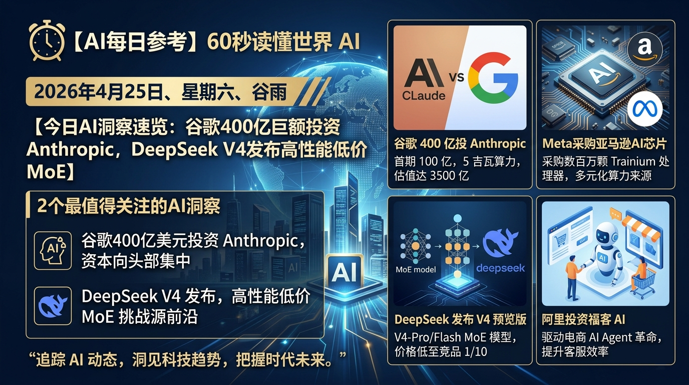 今天AI圈有两件大事值得重点关注。谷歌宣布向Anthropic投资最高400亿美元,同时提供5吉瓦算力,将Anthropic估值推至3500亿美元,是AI领域迄今最大单笔战略投资之一。与此同时,中国AI公司DeepSeek发布V4模型预览版,性能接近GPT-5.4等前沿模型,但价格仅为竞品的1/10,再次引发全球关注。国内外各5条精选资讯,带你快速掌握今日AI动态。