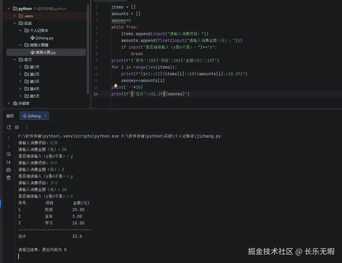 使用while循环,循环输入消费项目与消费金额,在循环末尾判断是否继续输入,继续不继续输入则退出循环。