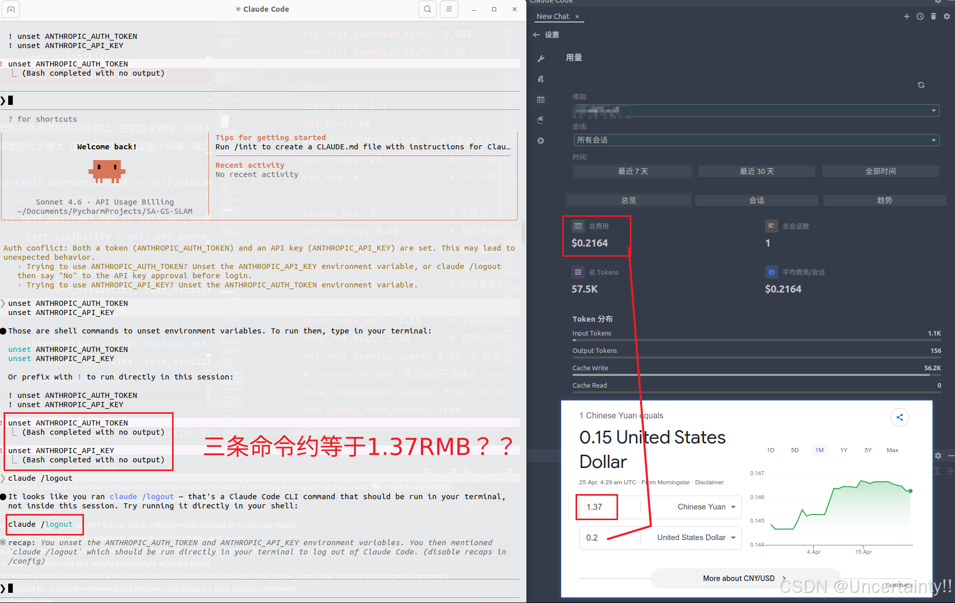 取消了一下环境变量,logout一下,竟然已经花了1.37RMB