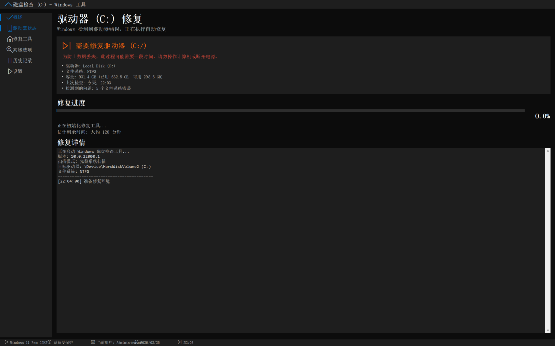 硬盘检查模式会模拟硬盘恢复进度的界面,看起来和电脑真的在进行硬盘修复一模一样。这个模式下无法通过任务管理器或Esc键退出,只能按特定组合键Ctrl+Shift+Q才能恢复正常,模拟效果非常真实。