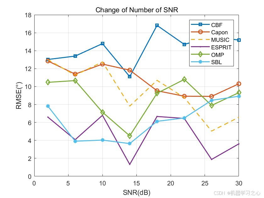 - 参数初始化:设置阵元数、阵元间距、快拍数、信噪比范围、角度搜索网格等。