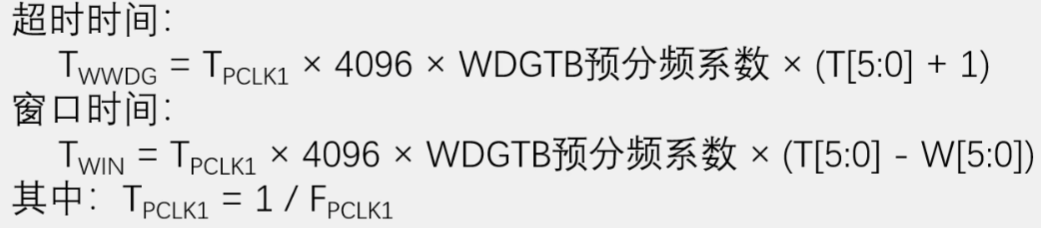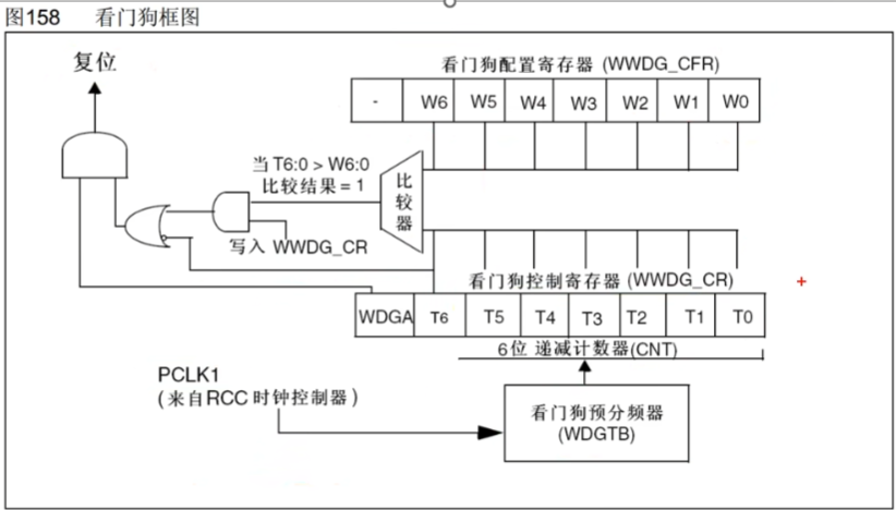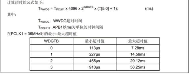 - 当T6为1、T5 ~ T0都为0时可以产生早期唤醒中断(EWI),用于重装载计数器以避免WWDG复位,仅申请一个标志位