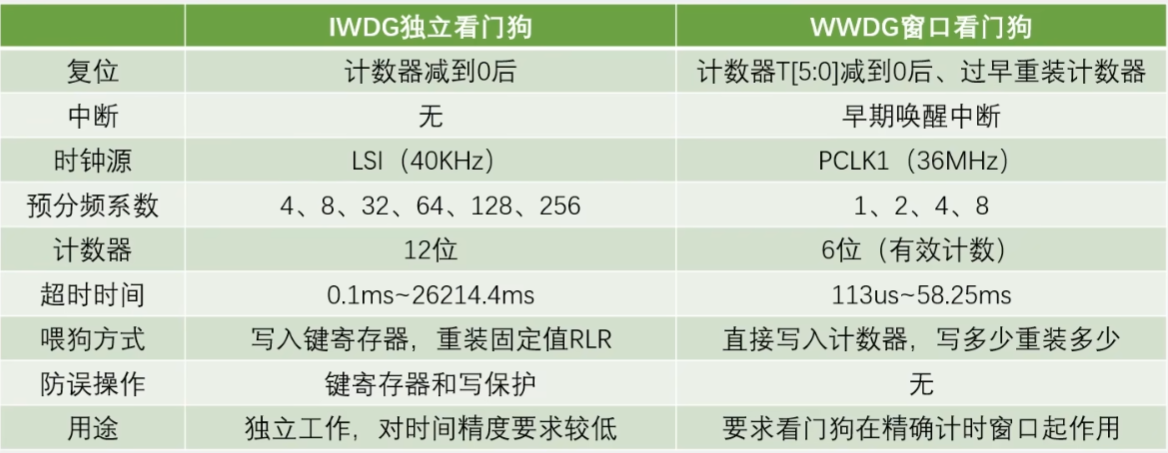 - 独立看门狗 (IWDG):独立工作,对时间精度要求较低