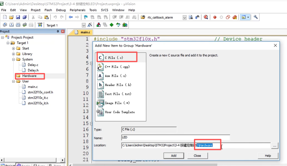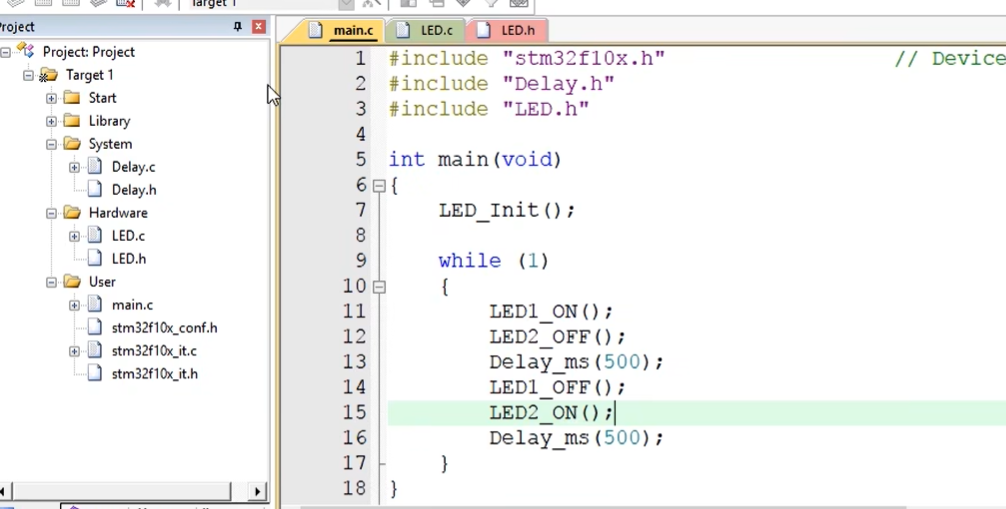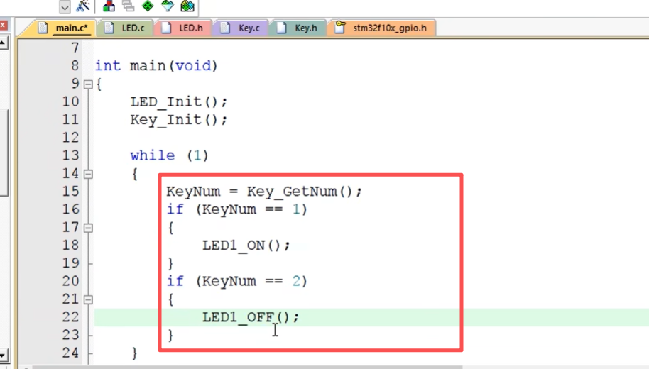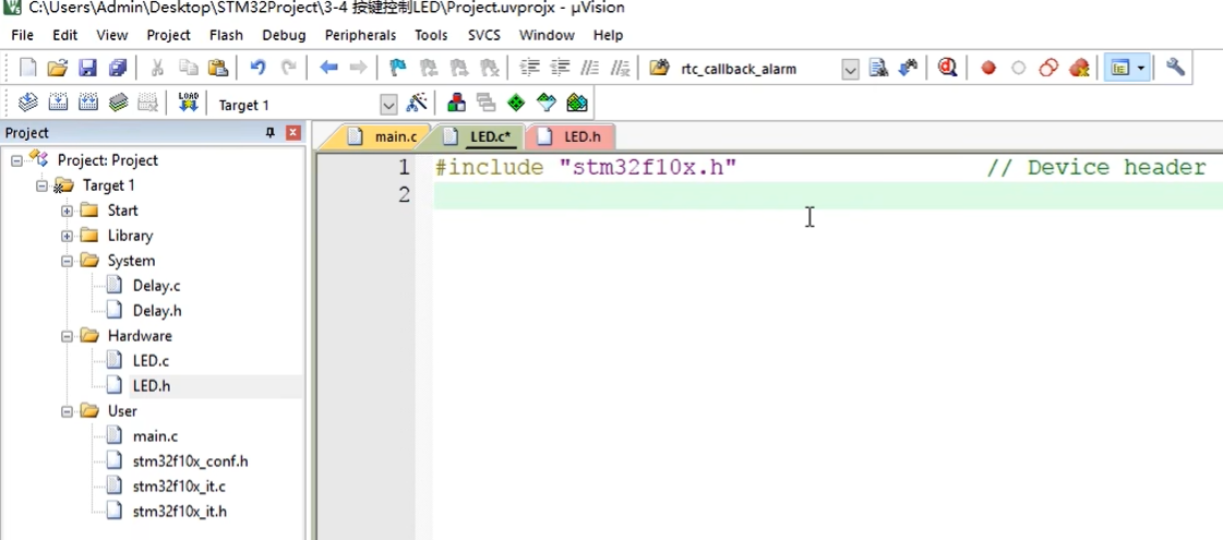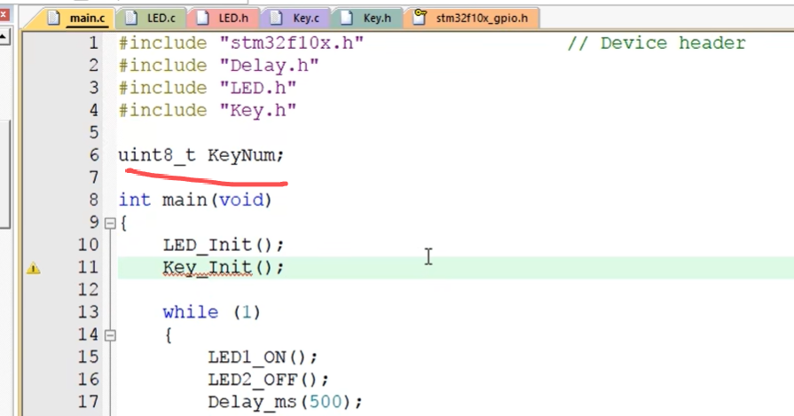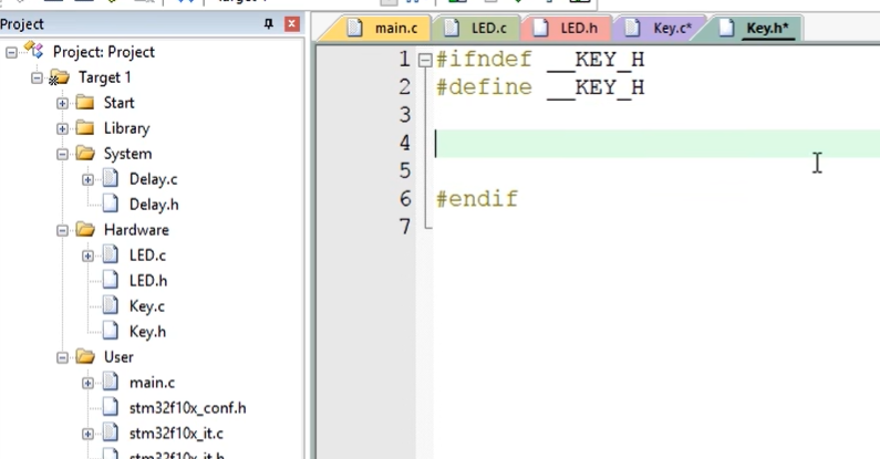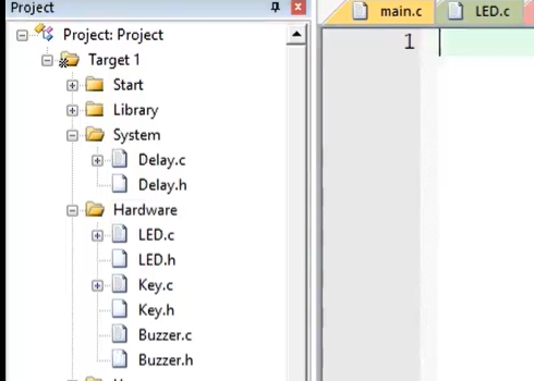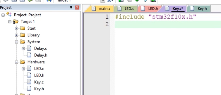 下面完成led和按键的驱动代码,这两部分驱动代码都混到主函数里面,代码太乱了,对于驱动代码而言,一般封装起来,单独放在.c和.h里,模块化编程方式: