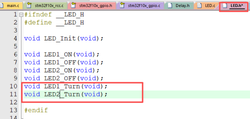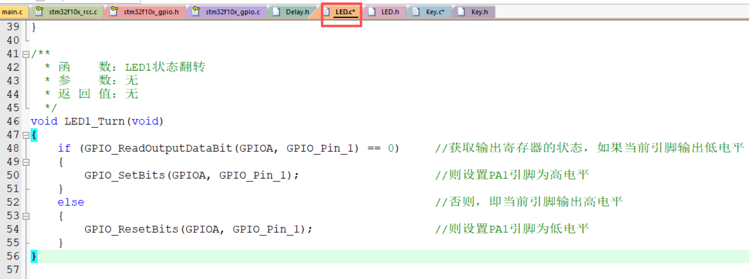 我们可以在 LED 的驱动里再加一个函数啊, void LED1Turn,调用这个函数, LED1 的状态取反。在里面我们可以写 if 复制一下 GPIO_ ReadOutputDataBit 这个函数,放到这里啊。