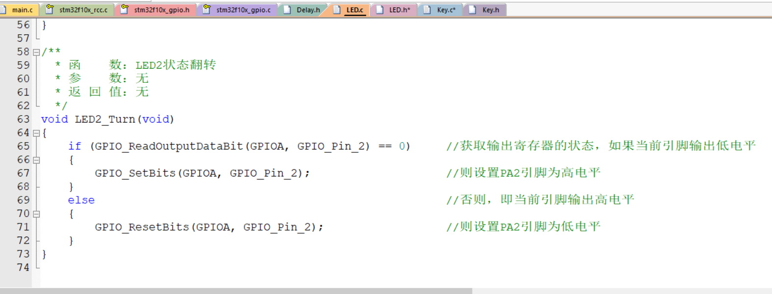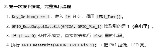 那我们演示的程序是按一下熄灭,再按一下点亮,也就是按键按下, LED 的状态取反,这个该怎么实现呢?这就需要用到 GPIO_ ReadOutputData 的函数了。