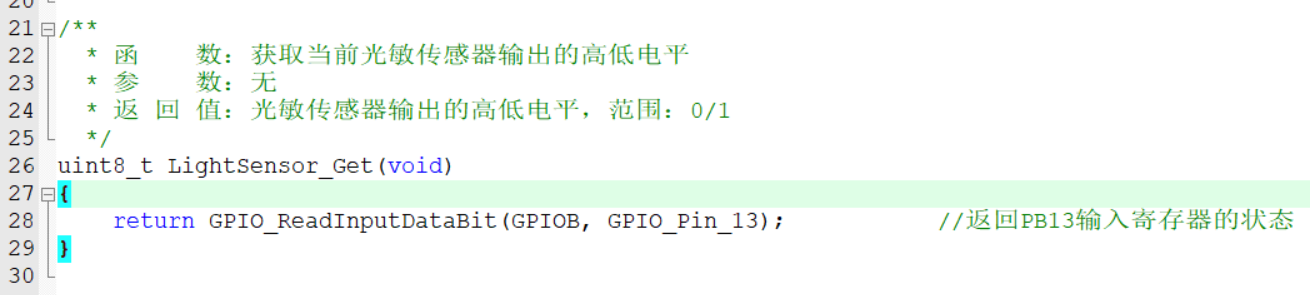 接下来写一个读取端口的函数,这里我们的需求比较简单哈,直接写个返回端口值的函数就行了。比如, UNIT8 t get void。然后直接 return 了 GPIOReadInputDataBit。GPIOB、 GPIOP13,这就完成了。