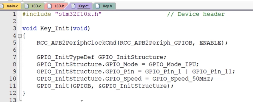 我们的按键是接在 GPIOB 上的,所以第一个参数是 RCC_ APB2 外设 GPIOB。 然后第二个参数写 enable 开启时钟。接着跟 GPIO 输出也是一样啊,另一个结构体变量 GPIO_ LED InitTypeDef,变量名叫 GPIO_ LED 的 structure。 然后把结构体的成员用点运算符都引出来,先放在这。