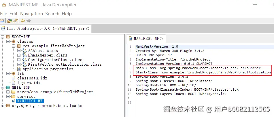 对于瘦jar,jvm先启动,JVM 读取 Jar 包内部的 META-INF/MANIFEST.MF文件,找到Main-Class,这个Main-Class,就是程序的入口。