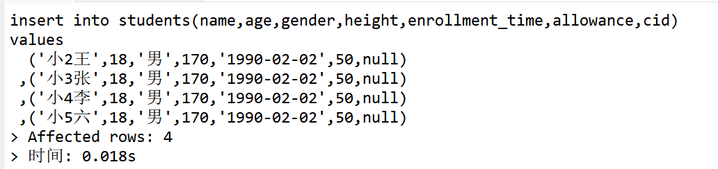 insert into students(name,age,gender,height,enrollment_time,allowance,cid)