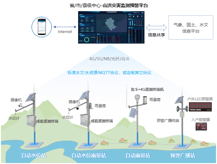 山洪灾害监测预警系统(山洪灾害防治监测预警系统) 由自动水位站、自动水位雨量站、自动雨量站、预警广播站 四部分组成。重点防治区需视频监控,现场数据通过北斗卫星或4G/NB-IoT无线网络远传至监测预警平台,平台对数据进行监测和分析,确定预警等级、影响范围和发布对象等预警信息,并发送给预警广播系统,广播系统可通过电话、短信、无线预警广播、移动预警终端、电视等多种形式进行预警。