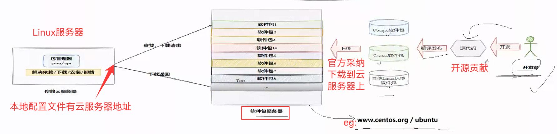 使用命令后,会根据配置文件的服务器地址**,去访问服务器,查找,下载,安装**