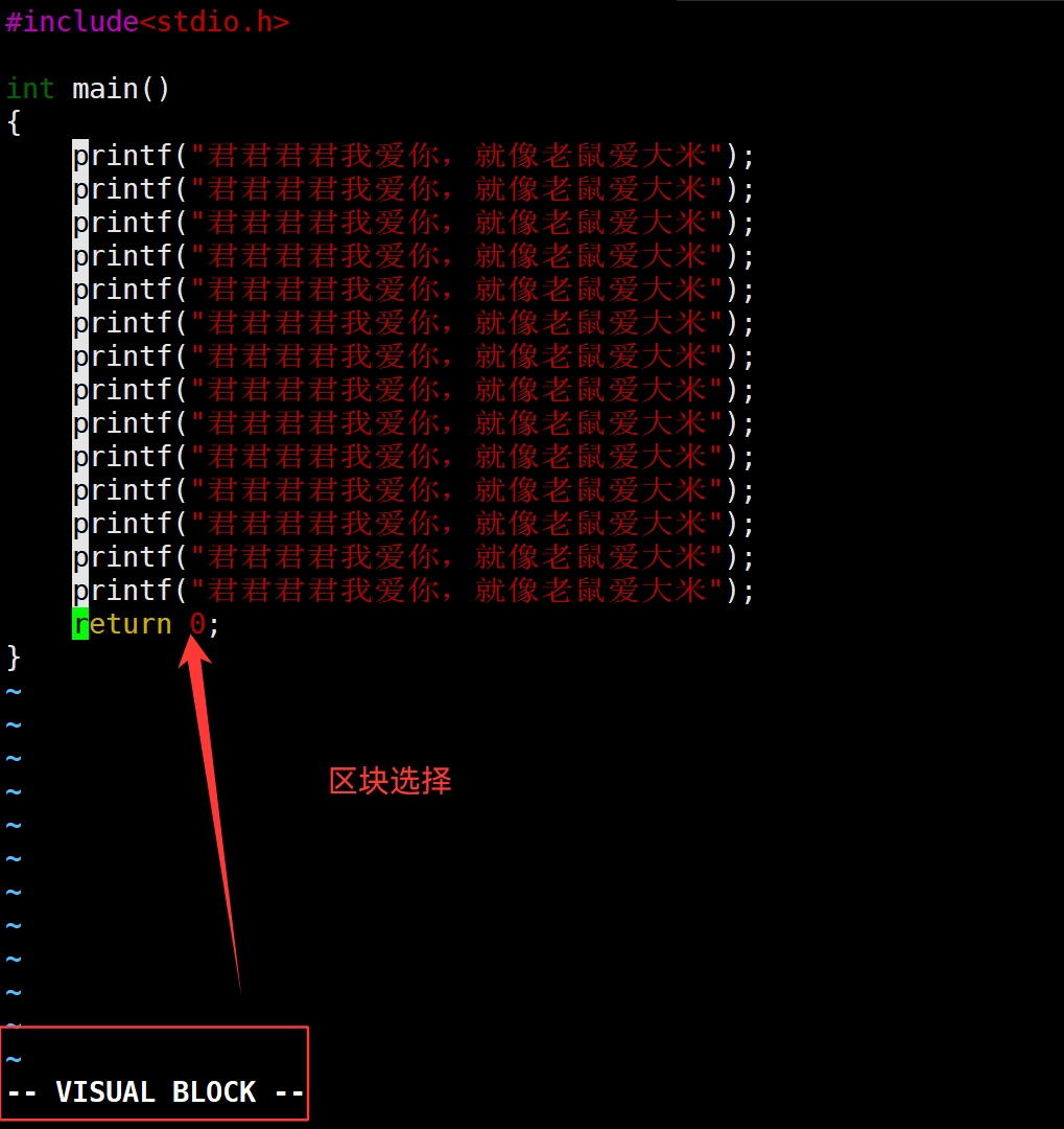 [ctrl + v ------区块选择,上下左右选中区域,可批量删除(d,x)](#ctrl + v ——区块选择,上下左右选中区域,可批量删除(d,x))