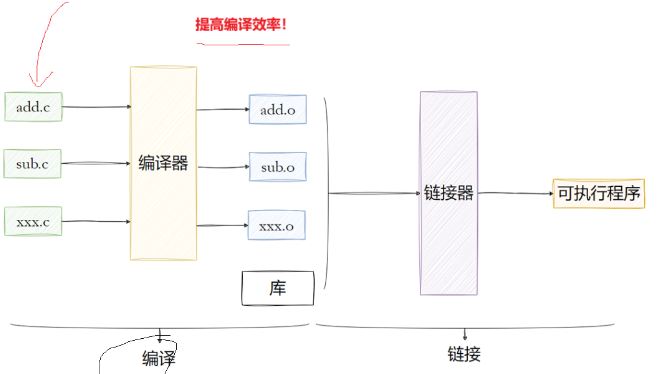 原因:修改单个.c 文件,只需重新编译这个文件对应的.o , 其他文件不用动!