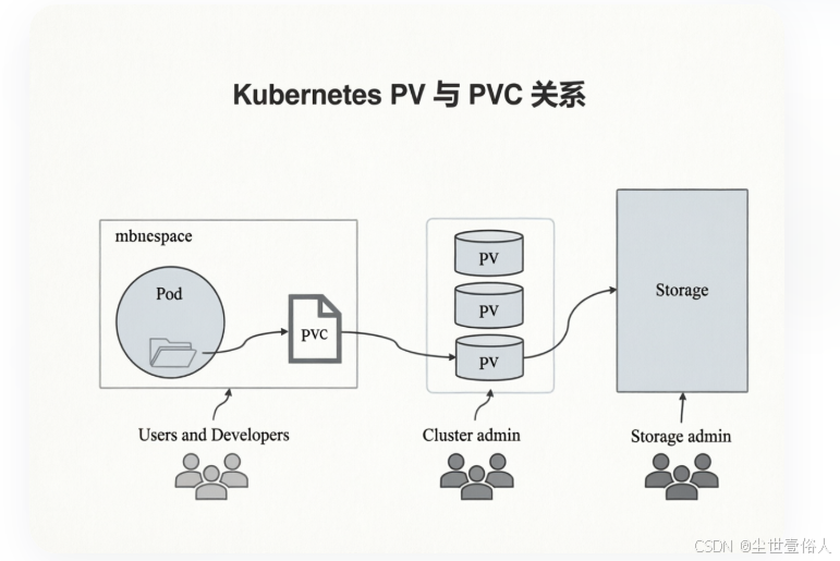 在 pv 创建完成后,它的STATUS是一个不可用状态,当你创建 pvc 时,默认会从 accessModes模式、storage大小、storageClassName名称中依次查找满足的条件,自动进行一对一绑定。那么这个时候一定会出现另一个疑惑既然pvc和pv只能一对一,那么为什么要分成两个资源类型?原因是上面的使用方式叫 静态PV 和 静态PVC