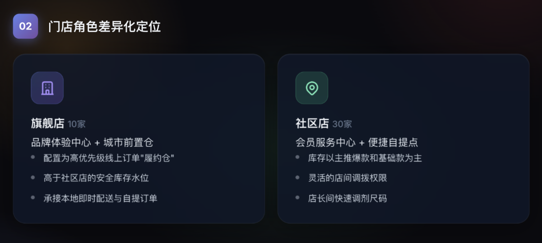 旗舰店(10家):定位"品牌体验中心+城市前置仓"。在OMS【门店策略】中将其配置为高优先级的线上订单"履约仓",并设置高于社区店的安全库存水位,以承接本地即时配送与自提订单。