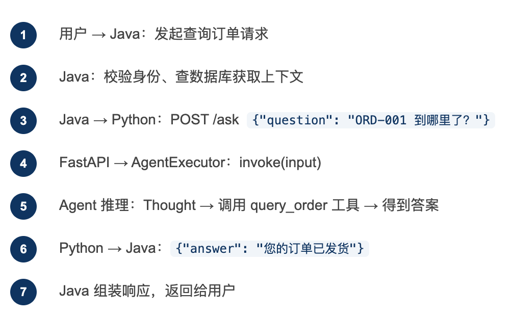 核心思路:Java 和 Python 不直接调用彼此的代码,而是通过 HTTP 接口协作。FastAPI 是 Python 侧的 HTTP 出口,Java 只需要知道接口地址和 JSON 格式,不需要了解 Python 内部实现。