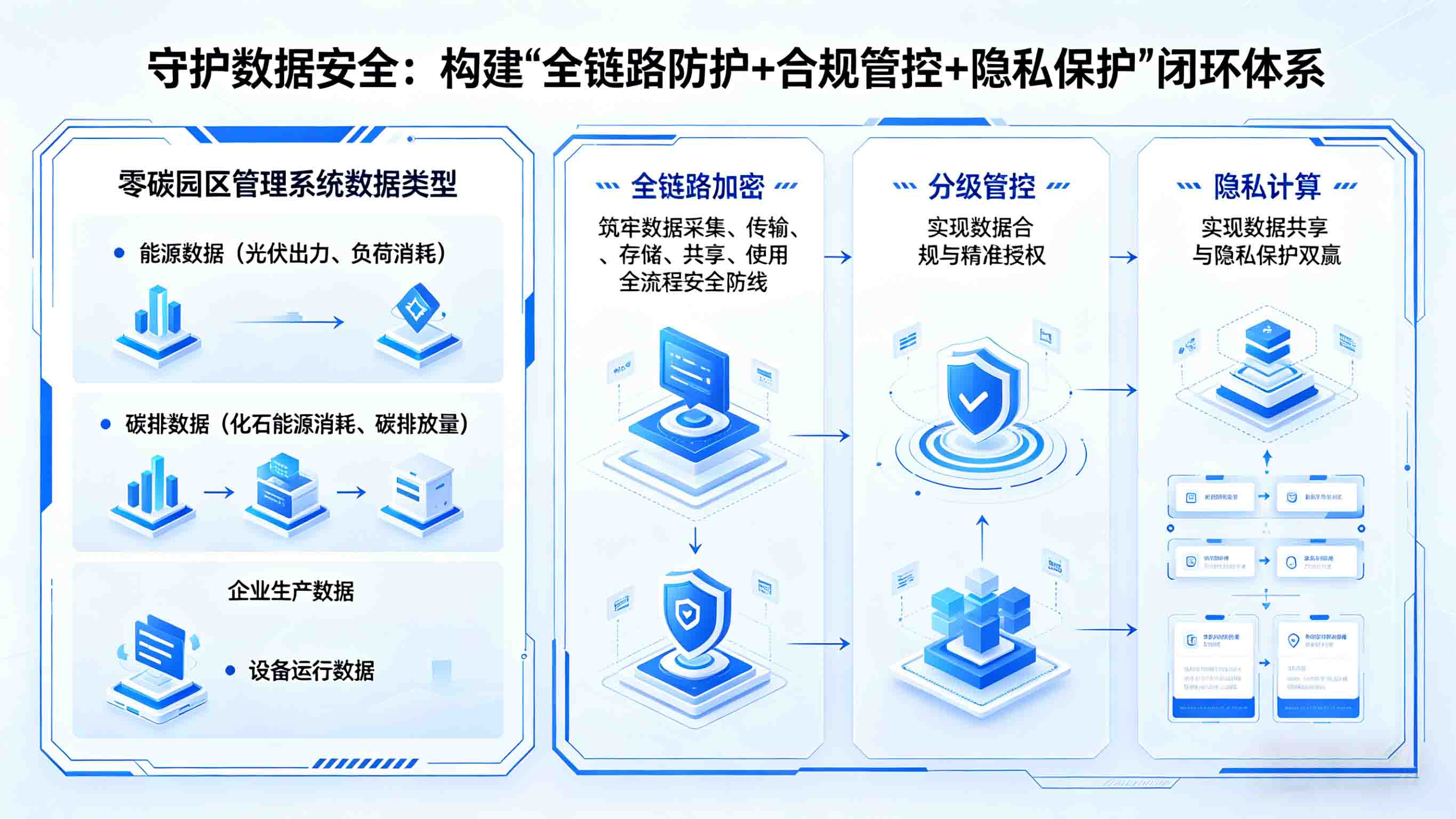 零碳园区的高效管控,需要跨企业、跨部门的数据共享------如园区管理者需要汇总各企业碳排数据进行整体管控,企业之间需要共享能源调度数据实现协同优化,但数据共享与隐私保护存在矛盾。管理系统通过隐私计算技术,实现"可用不可见"的数据共享模式,破解这一矛盾。