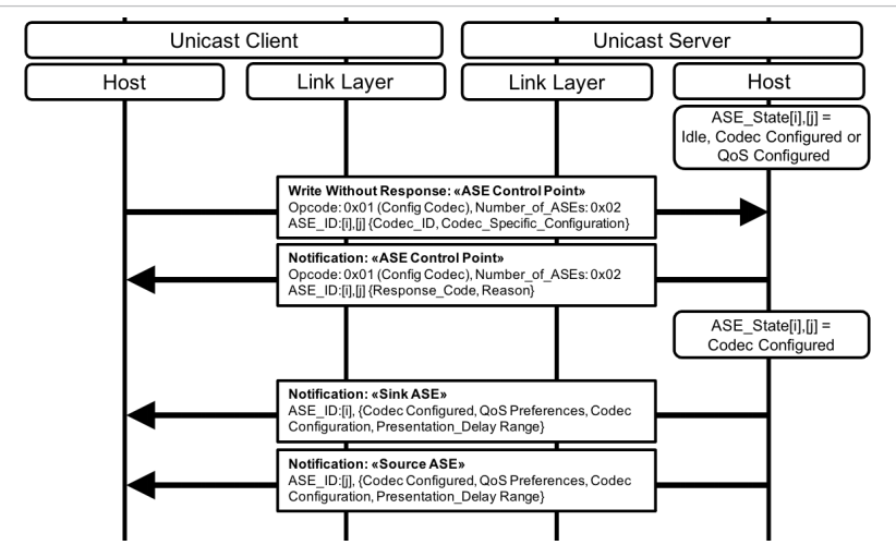 | Codec Configured | 0x01 | ASE 已应用编解码器配置。该配置可能由服务器自主应用,也可能由客户端请求。服务器正在暴露其首选的 QoS 参数,但 ASE 尚未应用任何 QoS 配置。 |