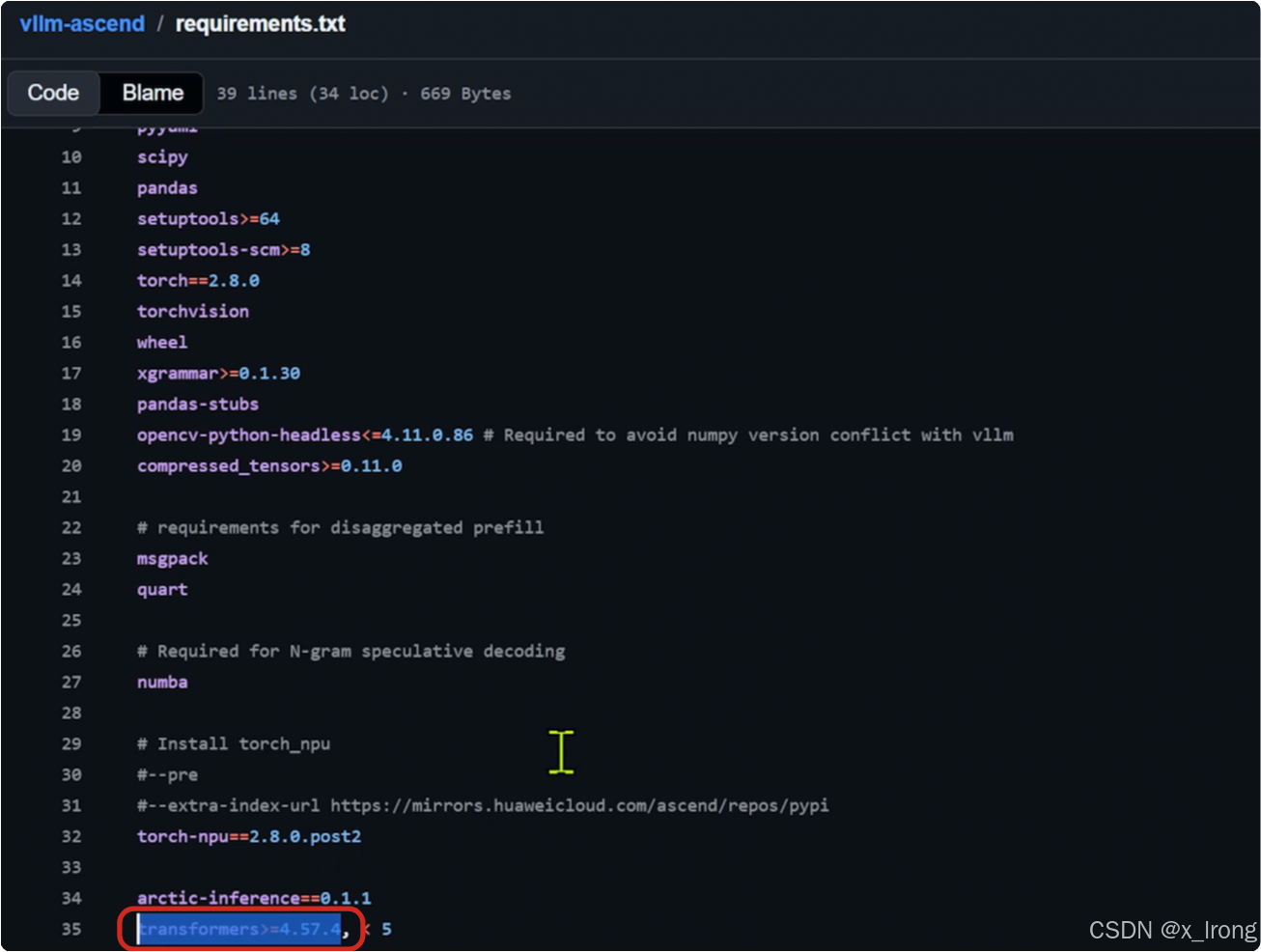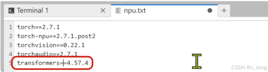 3.1.2 修改 requirements/npu.txt 文件(这一步主要是要 llamafactory 和 vllm-ascend 的 transformers 版本一致,注意需要提前确认两边支持同一版本的 transformers )
