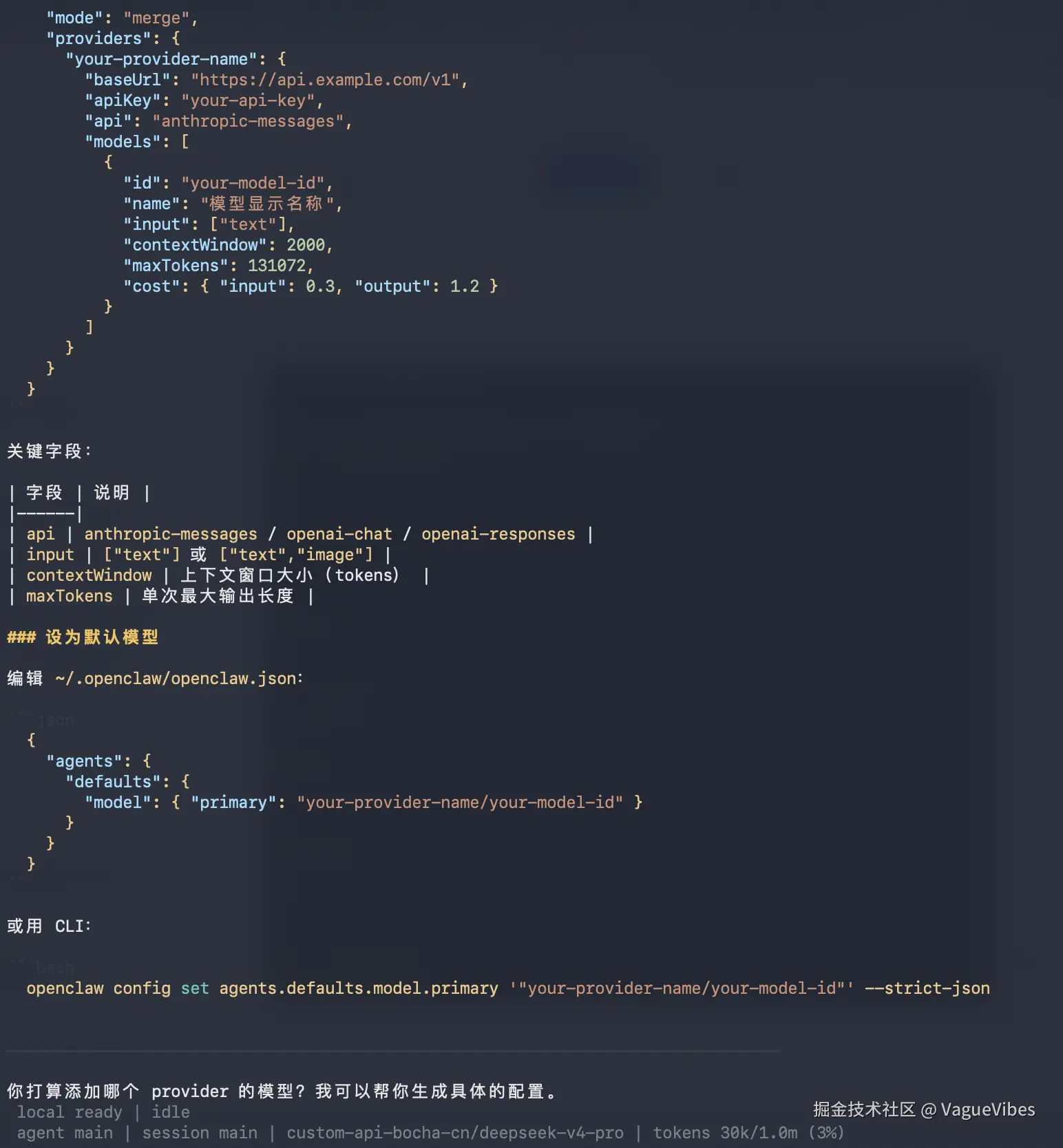 主要步骤包括定位 openclaw.json 文件、添加自定义 Provider 配置、设置默认调用模型以及重启网关验证。配置过程中需注意 contextWindow 参数调整及 api 协议凭证的正确填写,同时确保 API Key 安全。