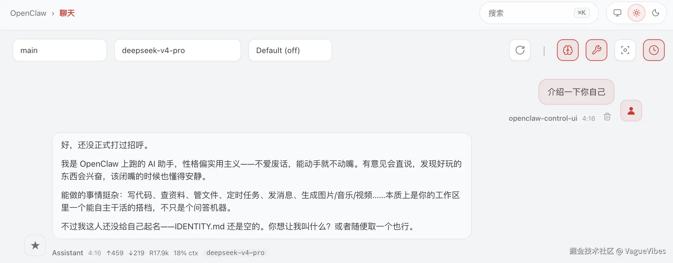 或者在命令行输入 openclaw chat,再与 agent 对话: