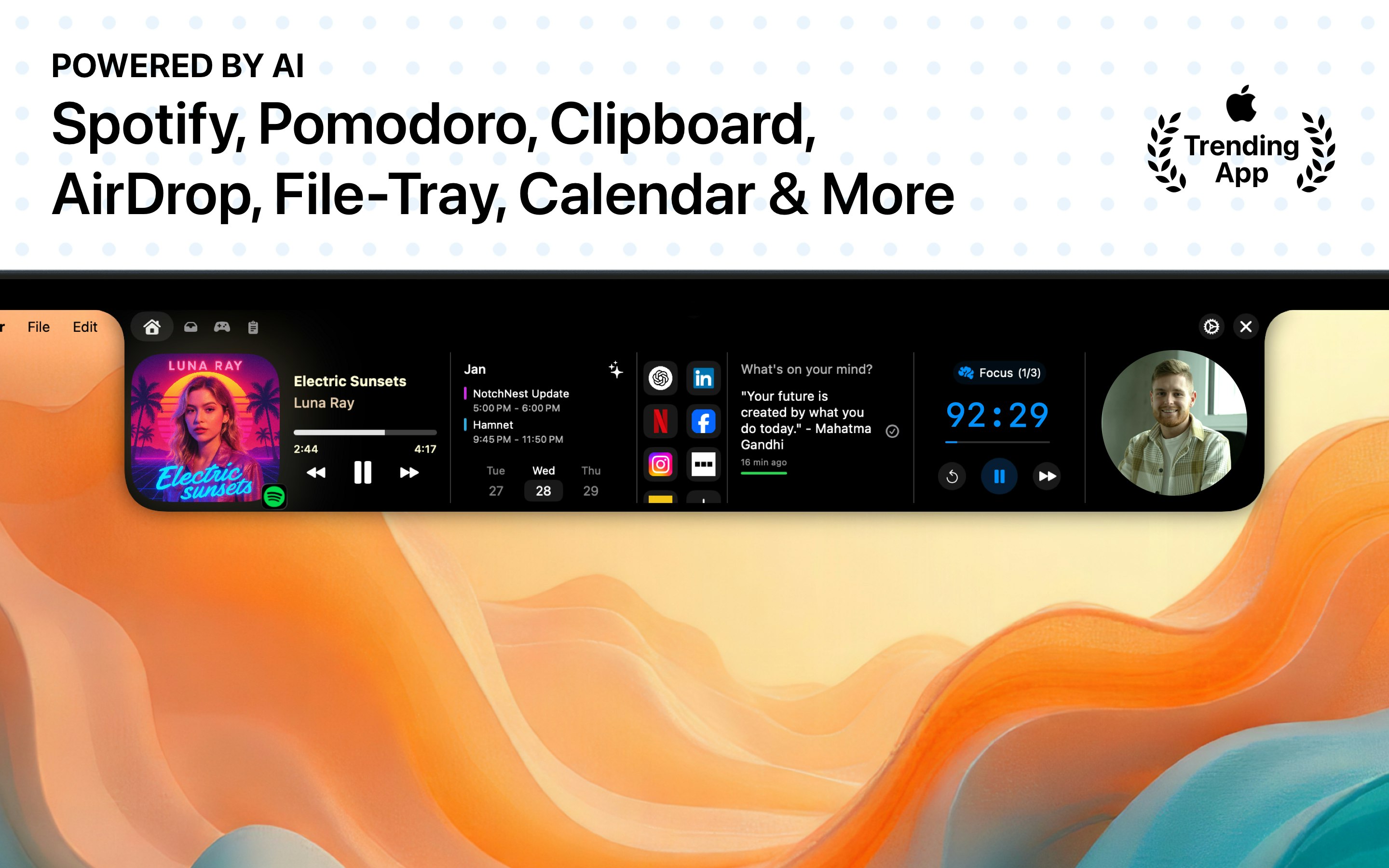 关键词:NotchNest AI, 苹果智能, 生产力中心, 日常简报, 剪贴板管理, 快速笔记, 音乐控制, 文件托盘, 无云, 数据安全