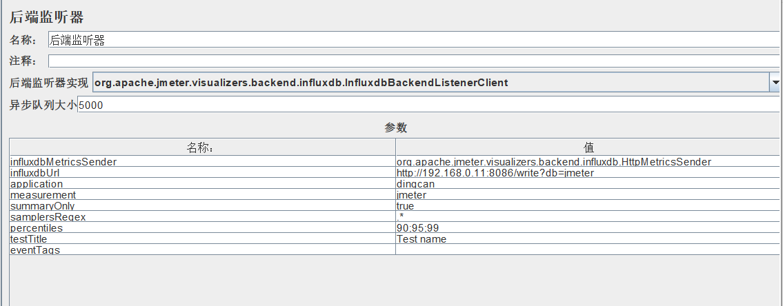含义 :JMeter 官方内置的、对接 InfluxDB 时序数据库 的后端监听器核心实现类。作用:定义当前监听器用什么逻辑、协议把压测指标推送到 InfluxDB,你这个是原生 InfluxDB 专属实现,适配 InfluxDB 1.x 版本。