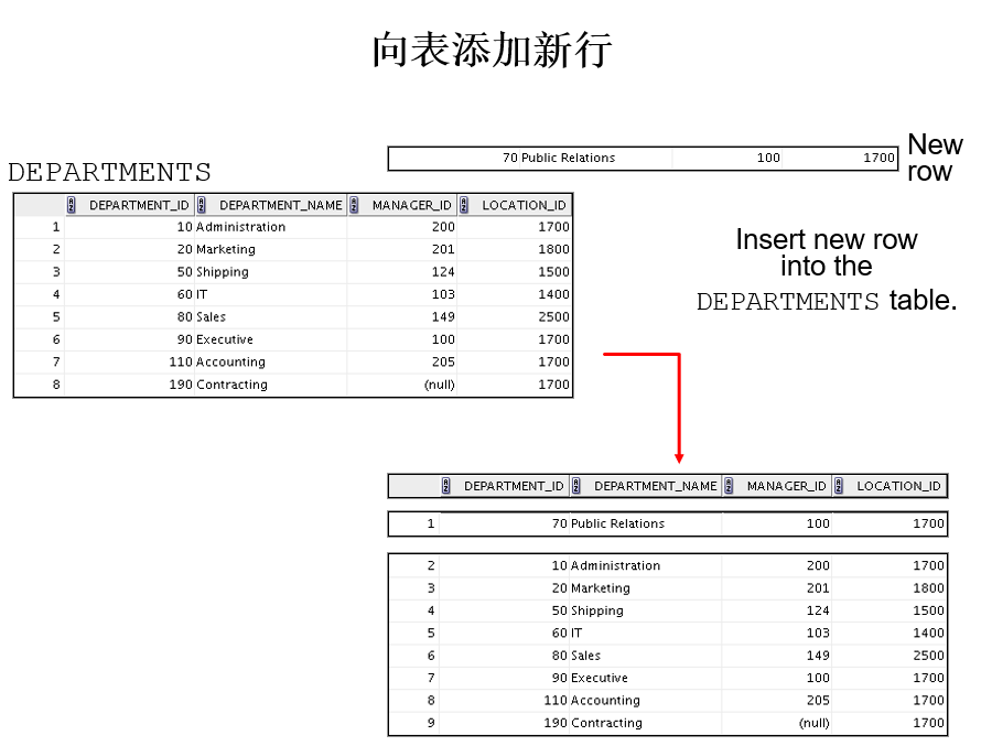 SQL> INSERT INTO departments(department_id, department_name, manager_id, location_id) VALUES (71, 'Public Relations', 100, 1700);
