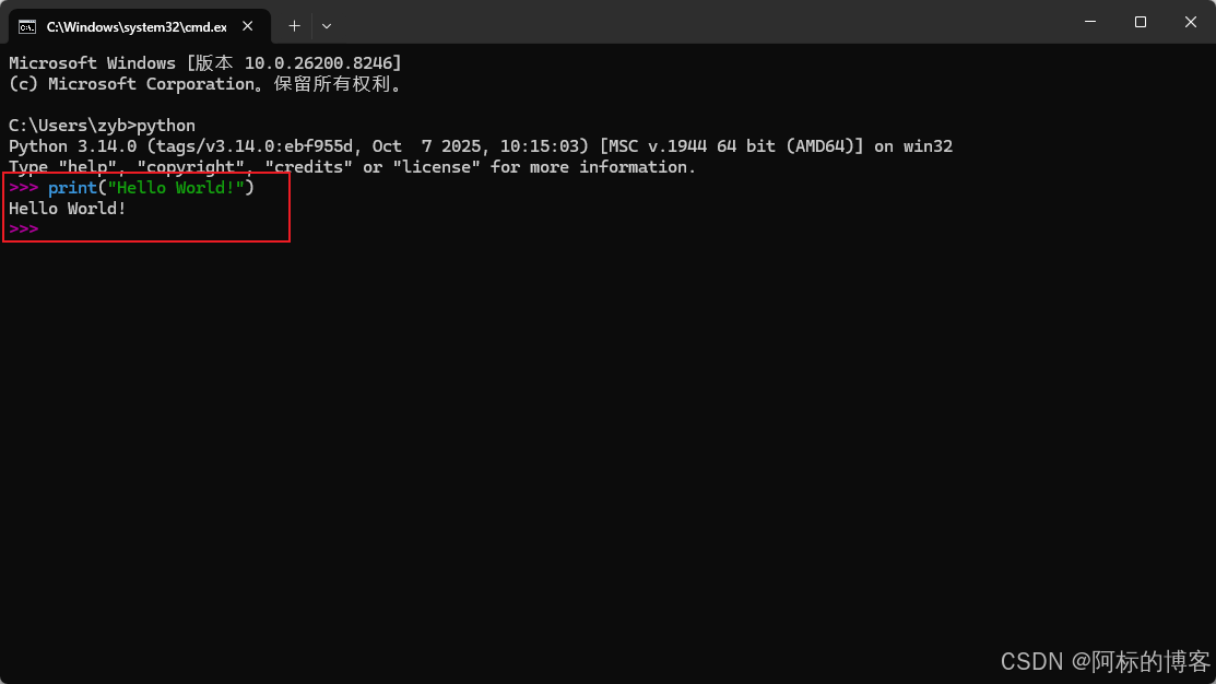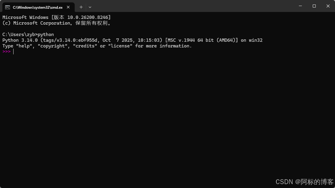 打开"命令提示符"窗口,进入python环境,在命令行界面中输入"python"后回车,进入Python交互模式。