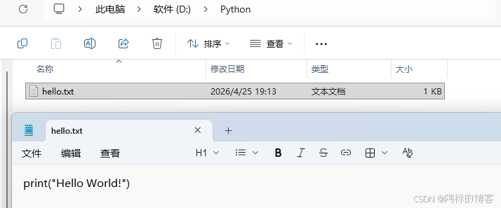 创建一个文本文件,在里面输入print('hello world!')