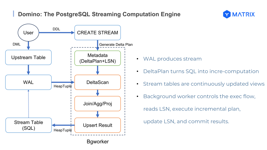 针对传统流处理链路(如 Kafka+Flink+DB)架构臃肿、数据冗余流转及维护成本高昂等痛点,YMatrix 创新的 Domino 引擎 通过充分挖掘 PostgreSQL 内核能力,实现了从"批处理"向"流式反应"模式的范式升级。