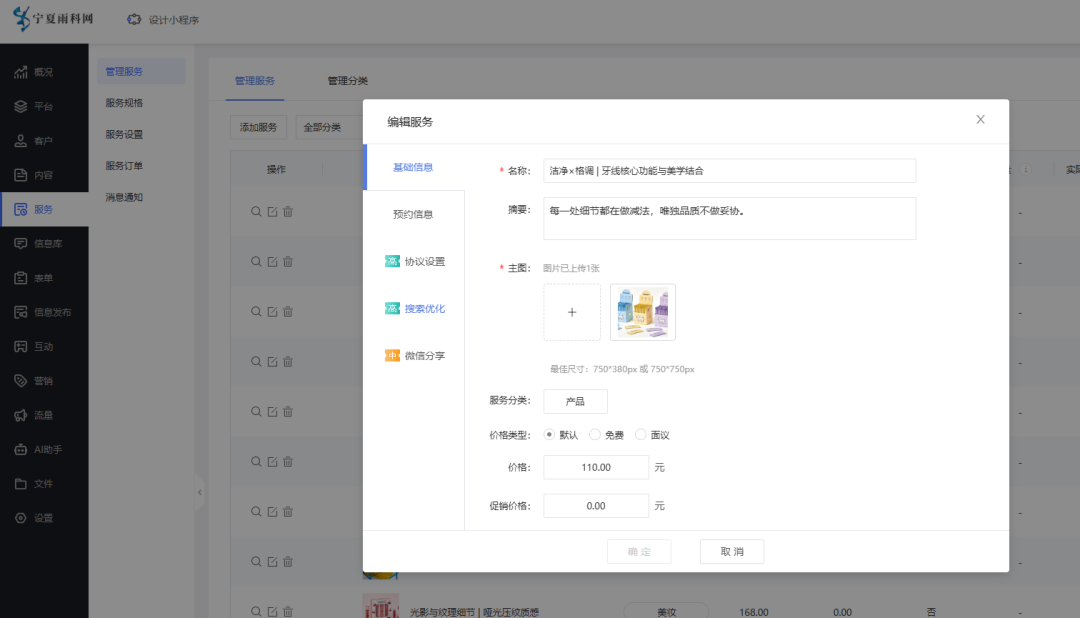 预约方面:服务上架信息项完善页面展示,满足客户填写信息在线预约的场景(可支付),商家后台预约订单查看跟进。印刷信息展示客户便捷服务触达。