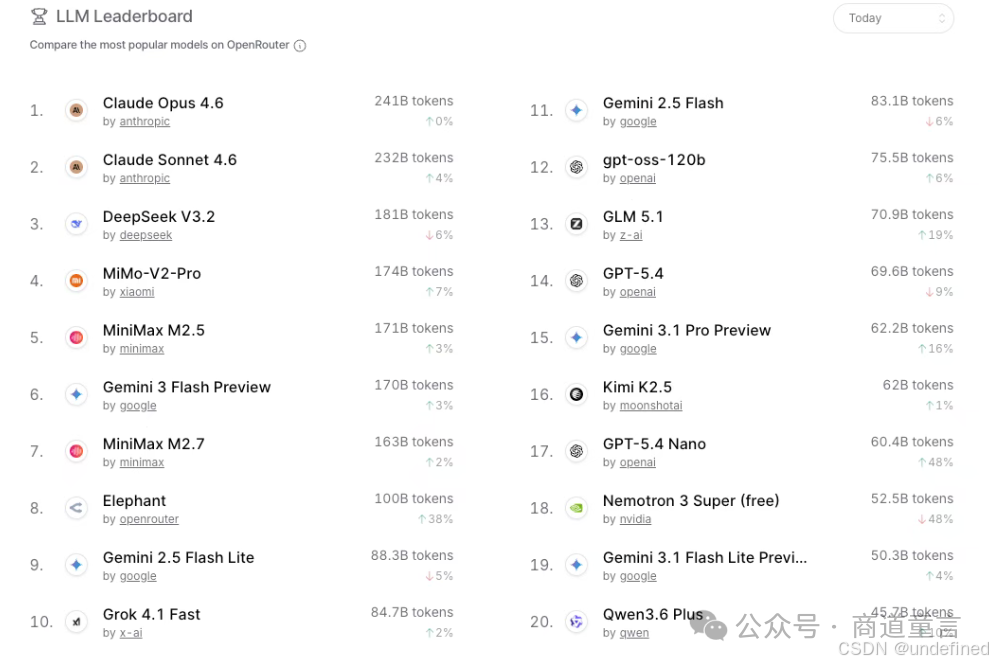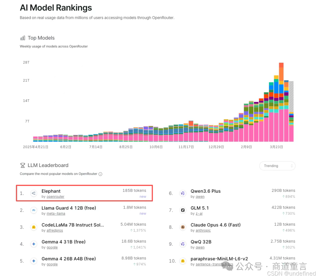 小尺寸模型涨幅惊人:GPT-5.4 Nano涨幅48%,Elephant单日涨幅38%。OpenClaw、Hermes Agent等应用成为这些小尺寸模型的"最大流量贡献"。