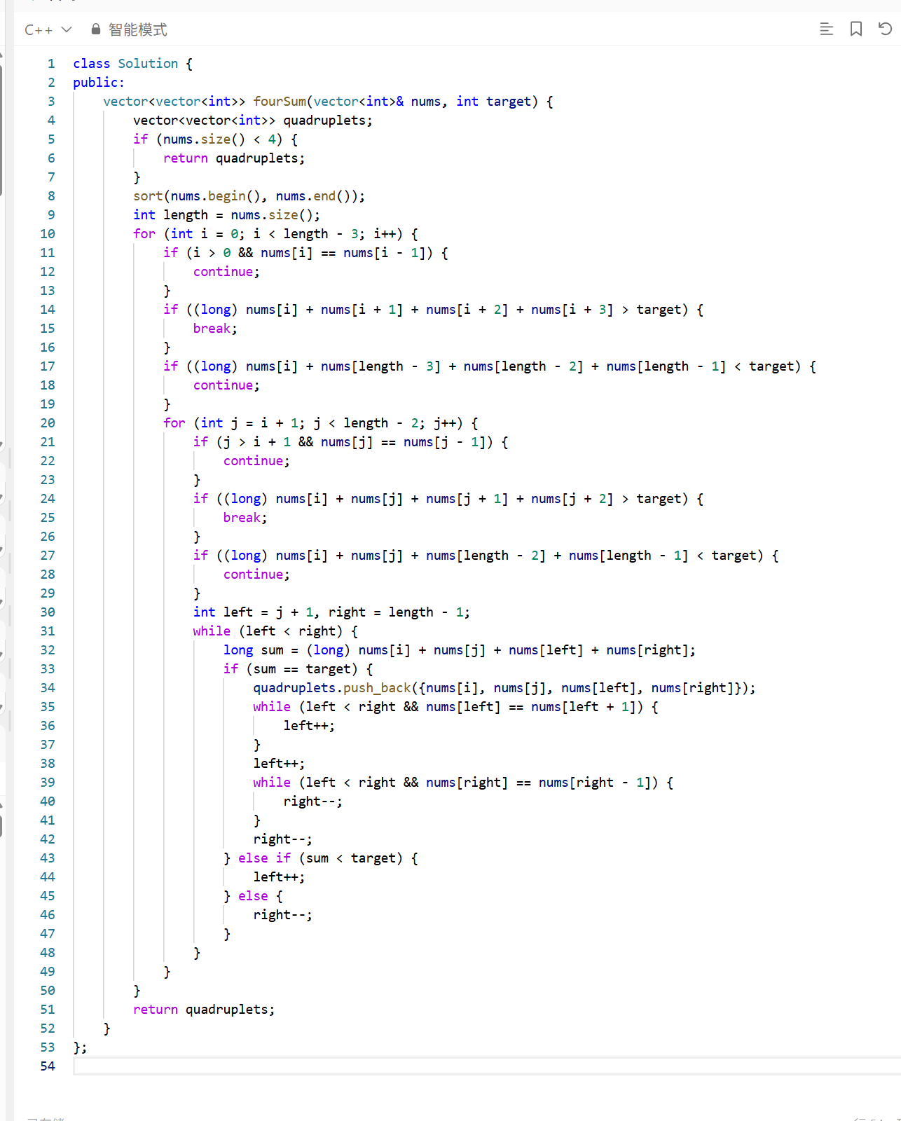 int类型的溢出问题,当四个int相加超过int范围时,会导致和的计算错误,所以必须用long类型来存储和,比如(long)nums[i] + nums[j] + nums[left] + nums[right]。 - 剪枝逻辑的设计 一开始想不到通过提前判断和的范围来剪枝: