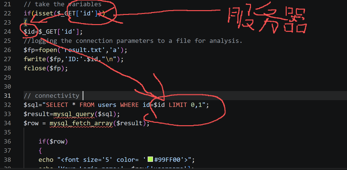 简单来说,就是服务器给到GET下,然后把id存在这个变量下,最后让sql语句执行,这样没有任何过滤,就会让我们想传什么就传什么