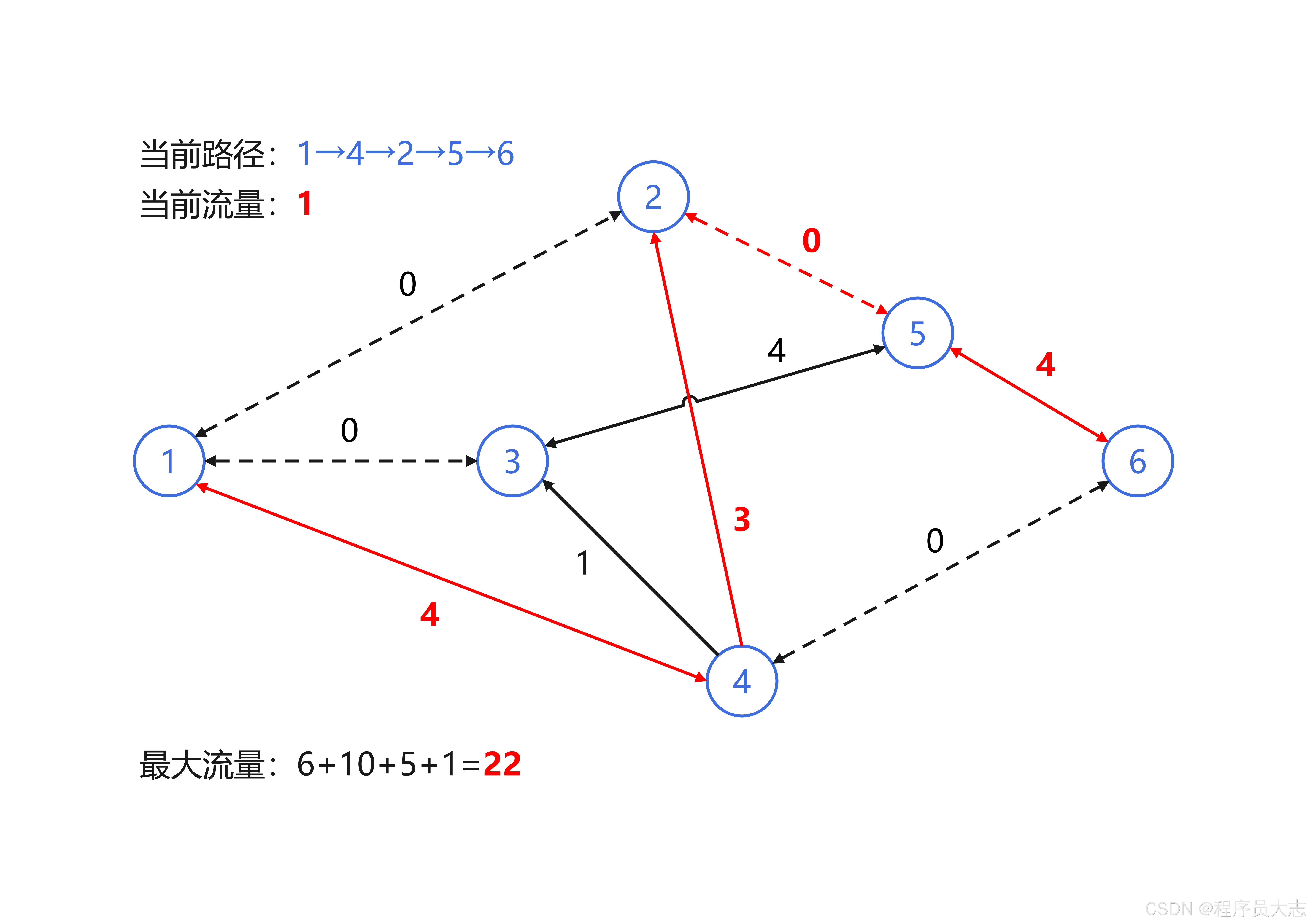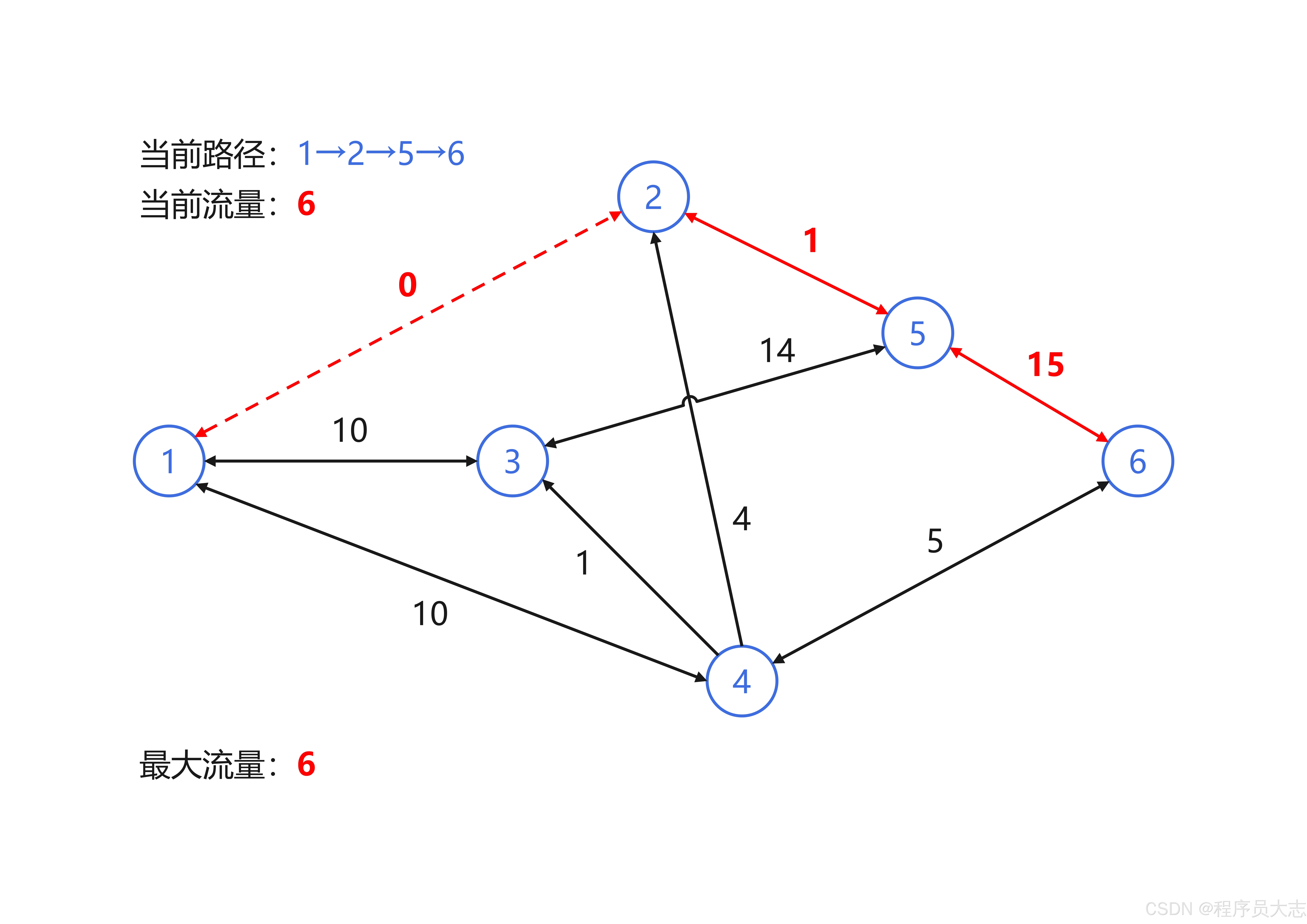 4、找出第二条路径,例如1→4→2→5→6 ,找出并记录最小流量1,计算并更新到图中;