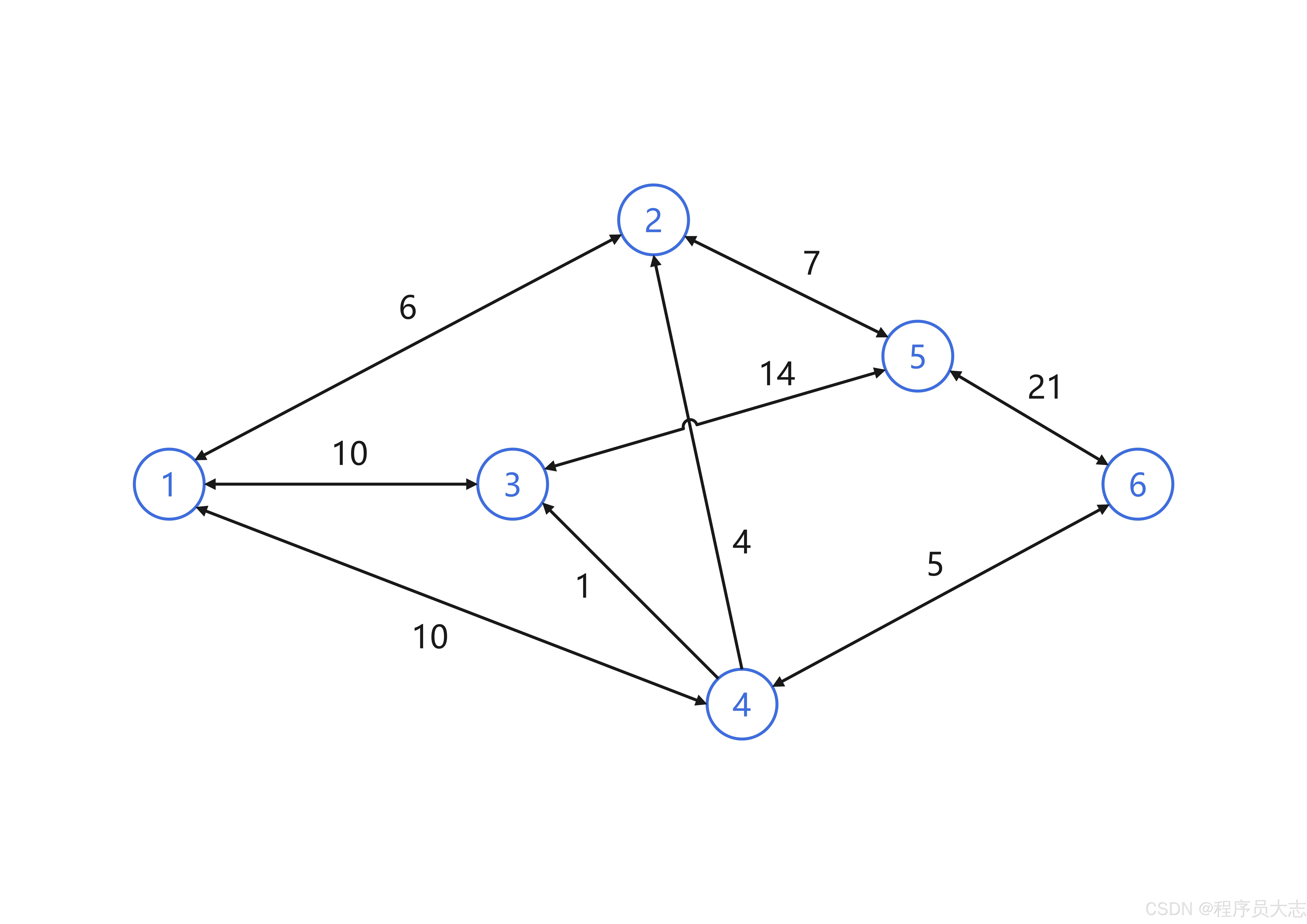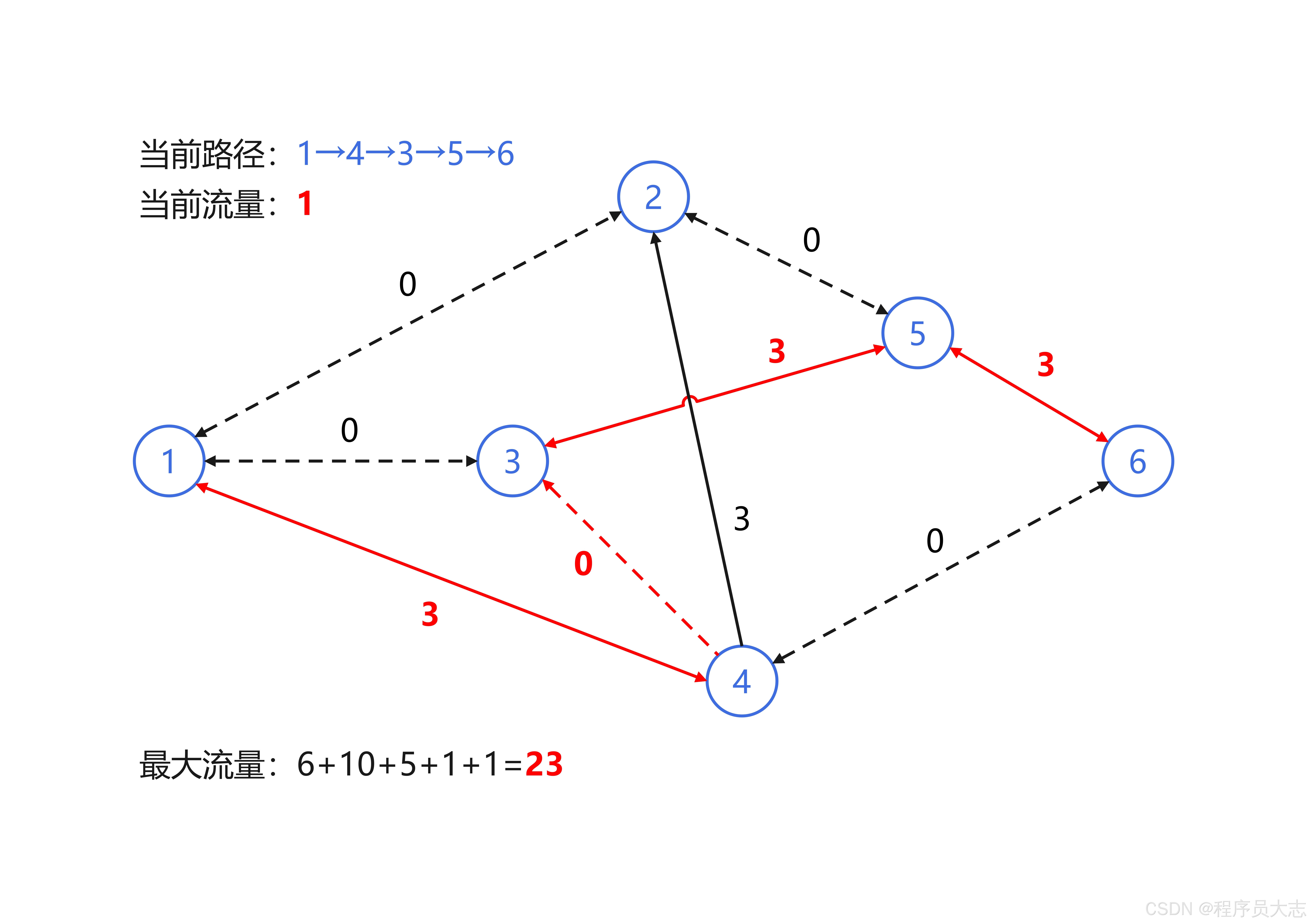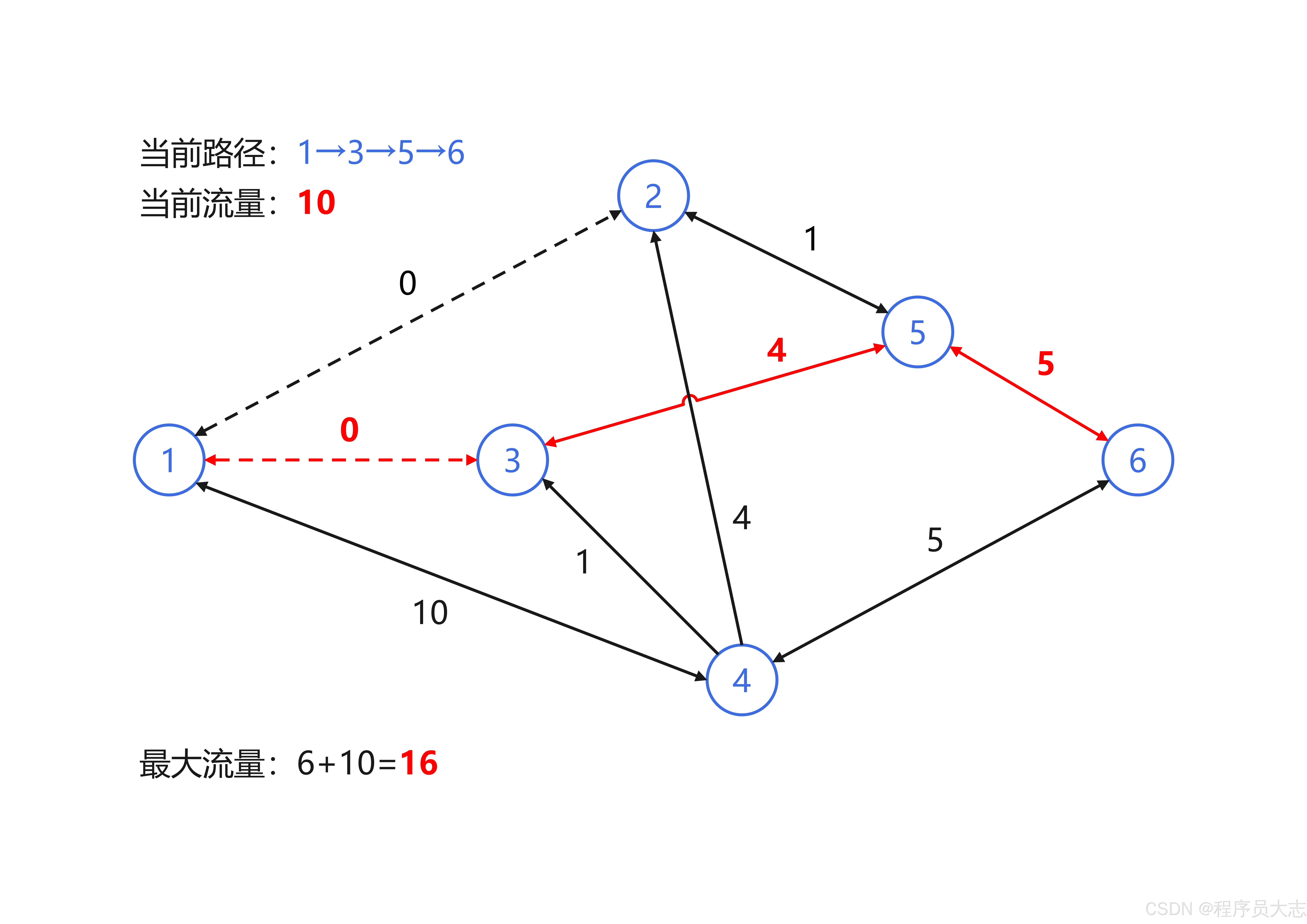 5、找出第二条路径,例如1→4→3→5→6 ,找出并记录最小流量1,计算并更新到图中;