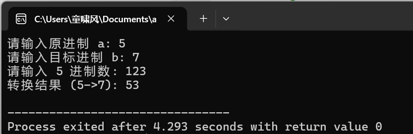 cout << "转换结果 (" << baseA << "->" << baseB << "): " << result << endl;