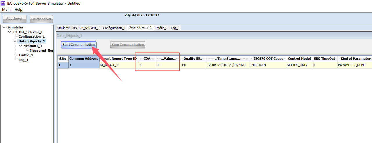 点击 Start Communication 启动 104 从站服务, 即可成功运行模拟器
