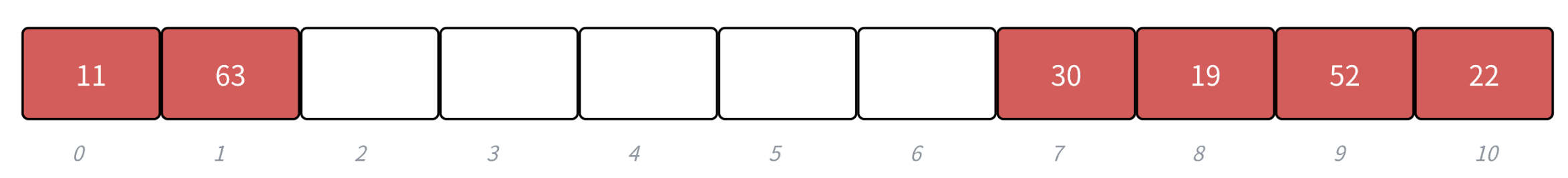 - 下面演示{19,30,52,63,11,22}等这一组值映射到M=11的表中。