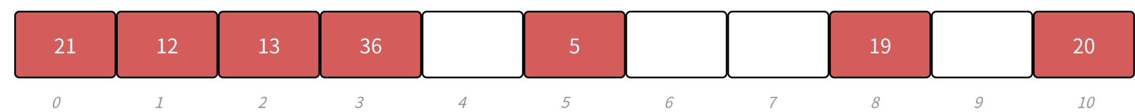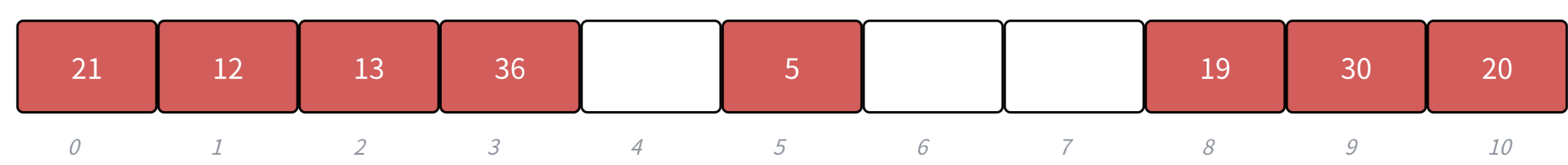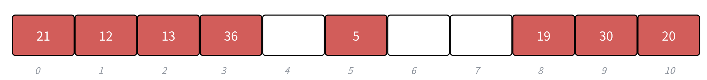 h(19) = 8 , h(30) = 8 , h(5) = 5 , h(36) = 3 , h(13) = 2 , h(20) = 9 , h(21) = 10, h(12) = 1